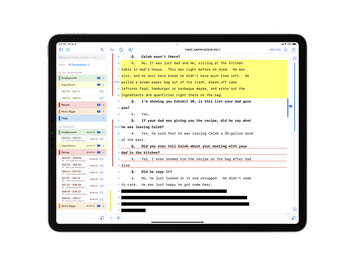 Take command of your deposition transcripts with the ability to create designations and assign issue codes, while also offering options to highlight, underline, redact, or add notes, ensuring meticulous transcript analysis.
