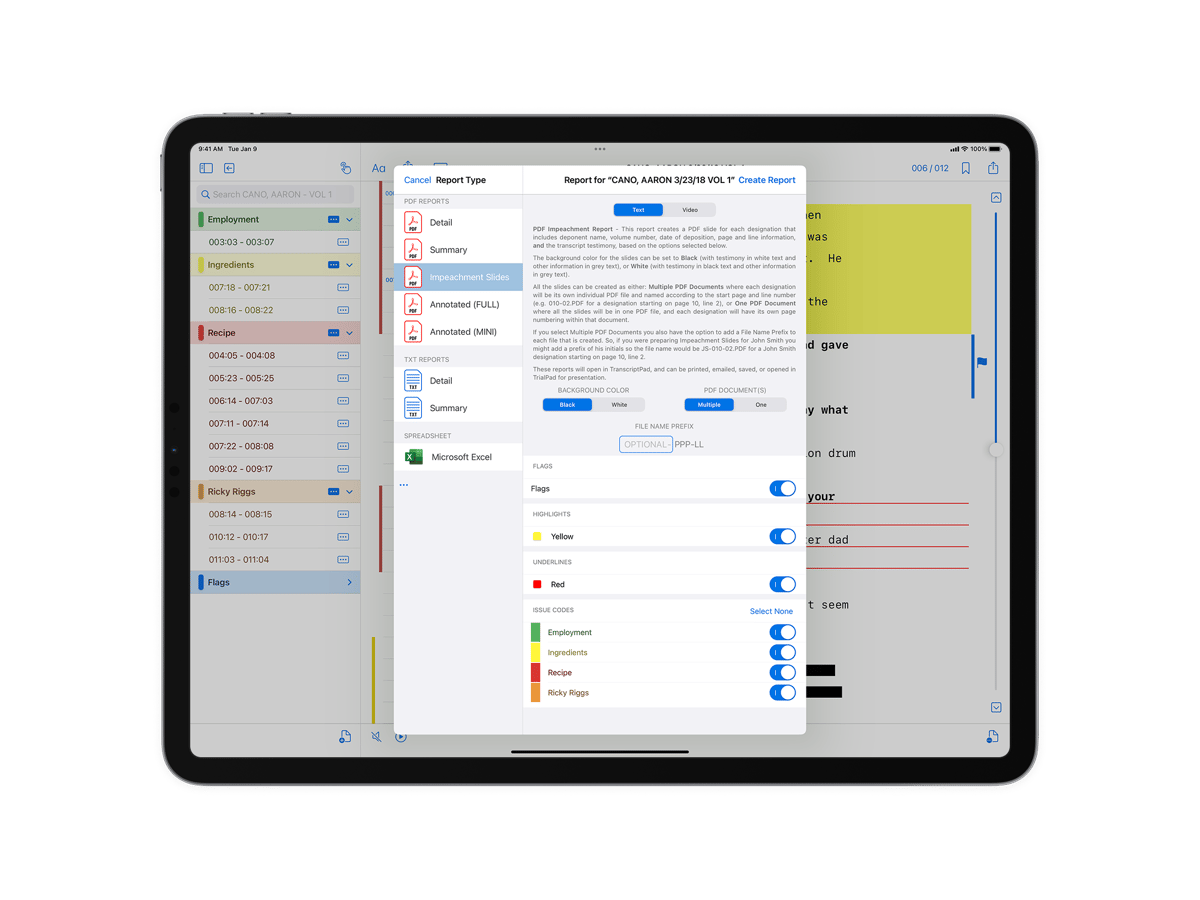 Generate and export impactful impeachment slides, thoughtfully formatted to include designation information, for compelling presentations using TrialPad.
