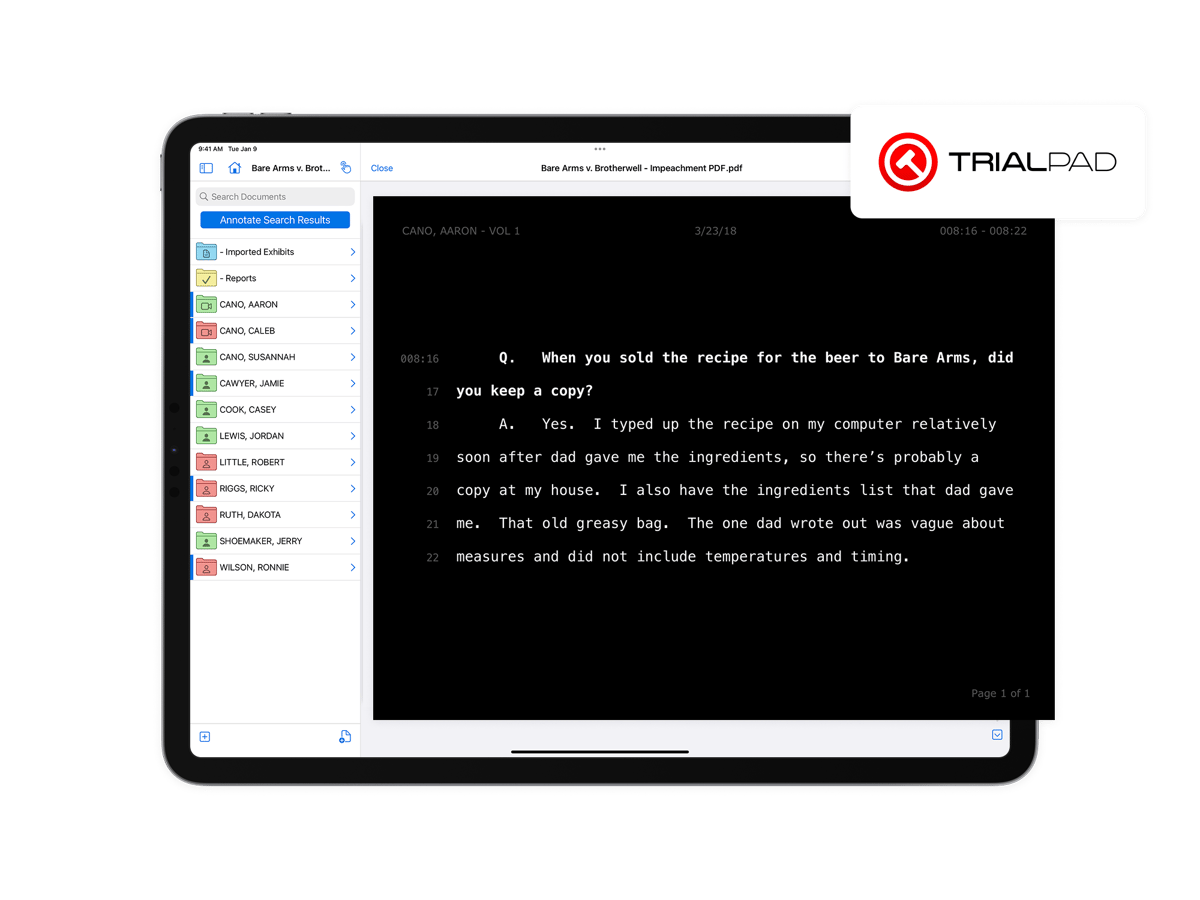 Seamlessly sync and edit video depositions, preview video testimony, and export clips complete with subtitles to enhance your presentation through TrialPad.