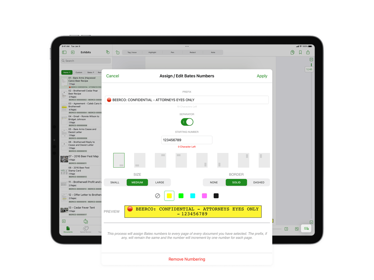Enhance professionalism and organization by easily adding custom exhibit stickers, complete with your case information, which increment automatically, ensuring seamless tracking of exhibits.