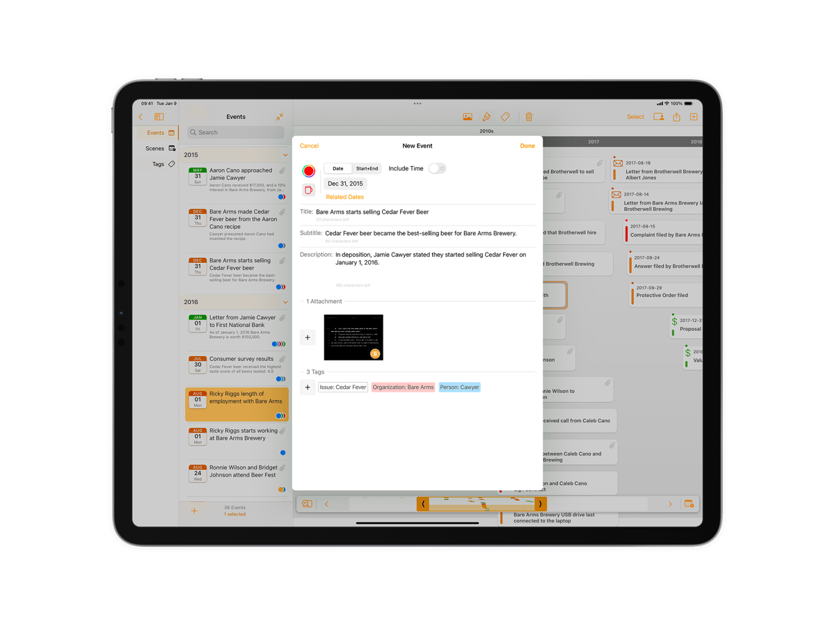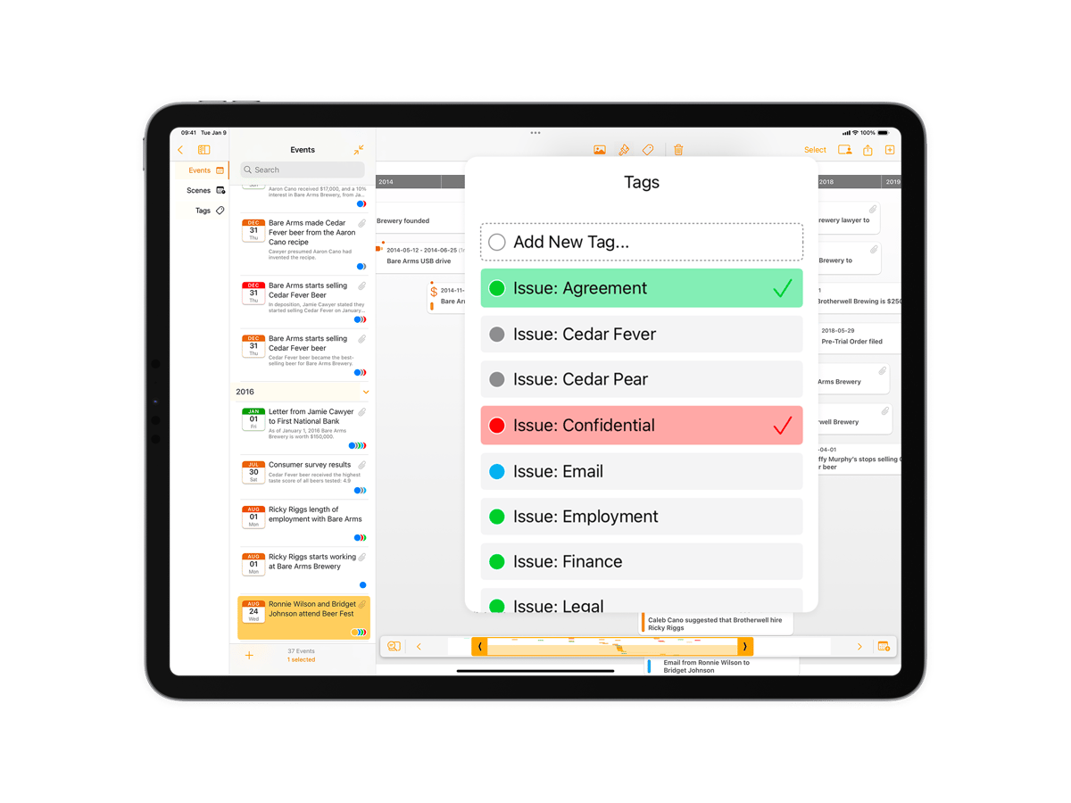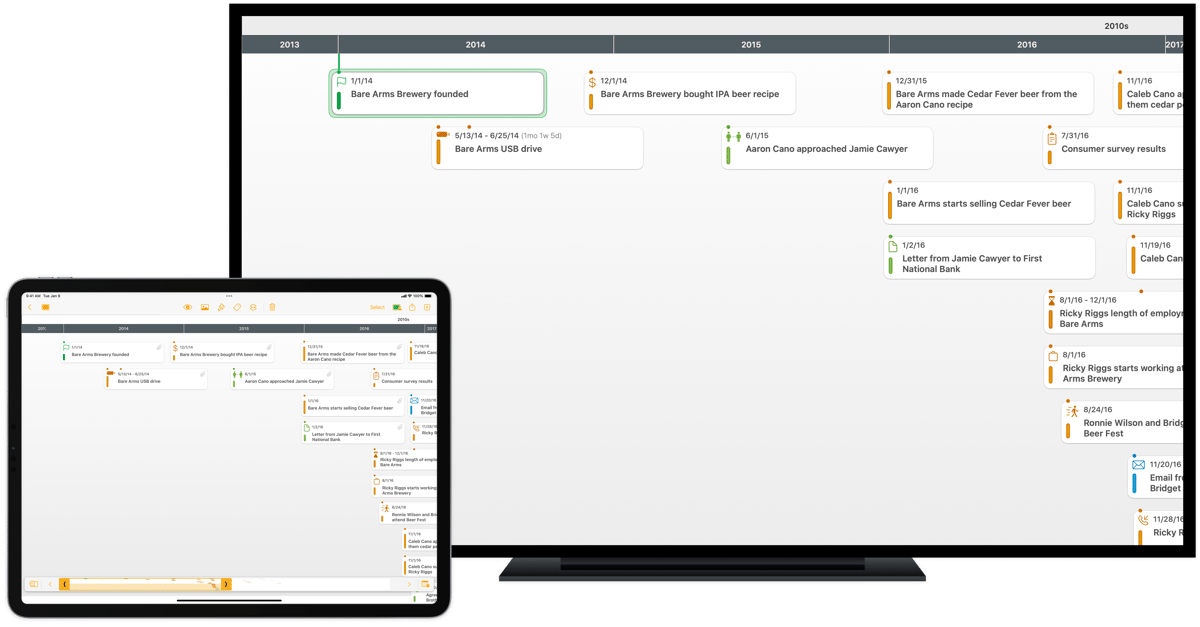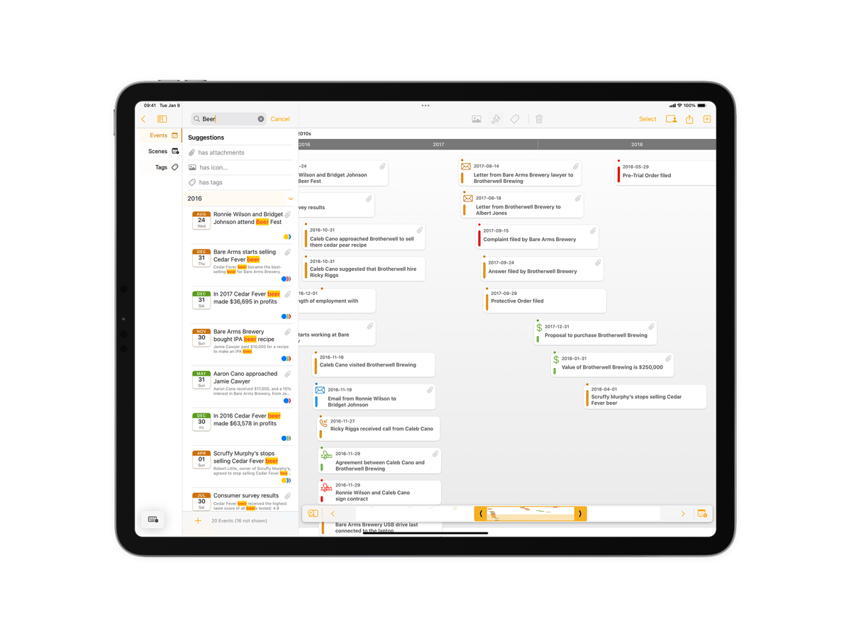 Link people, issues, and facts to events, and enhance visual clarity by adding icons and colors to highlight associations and patterns within your timeline.