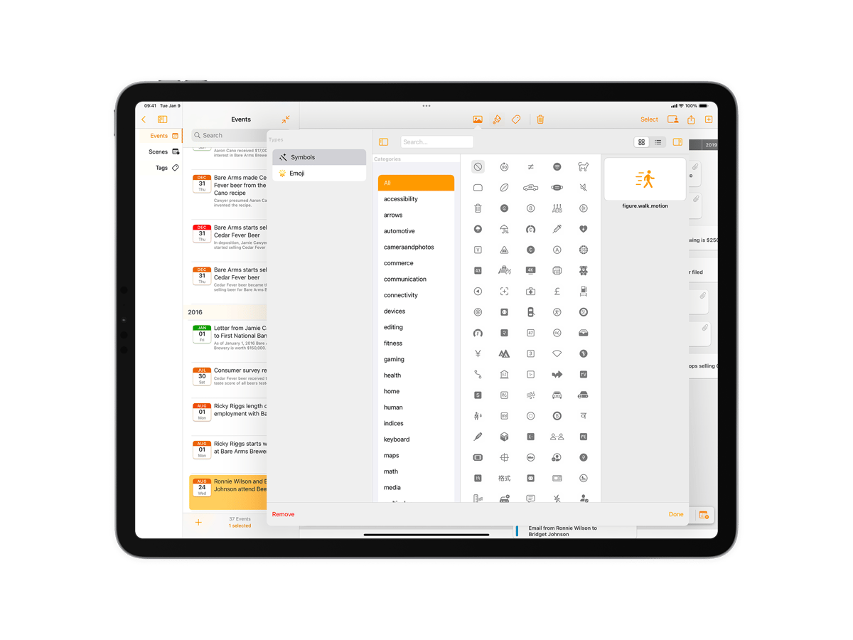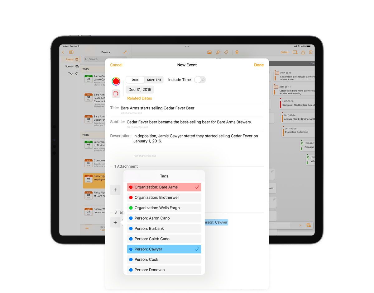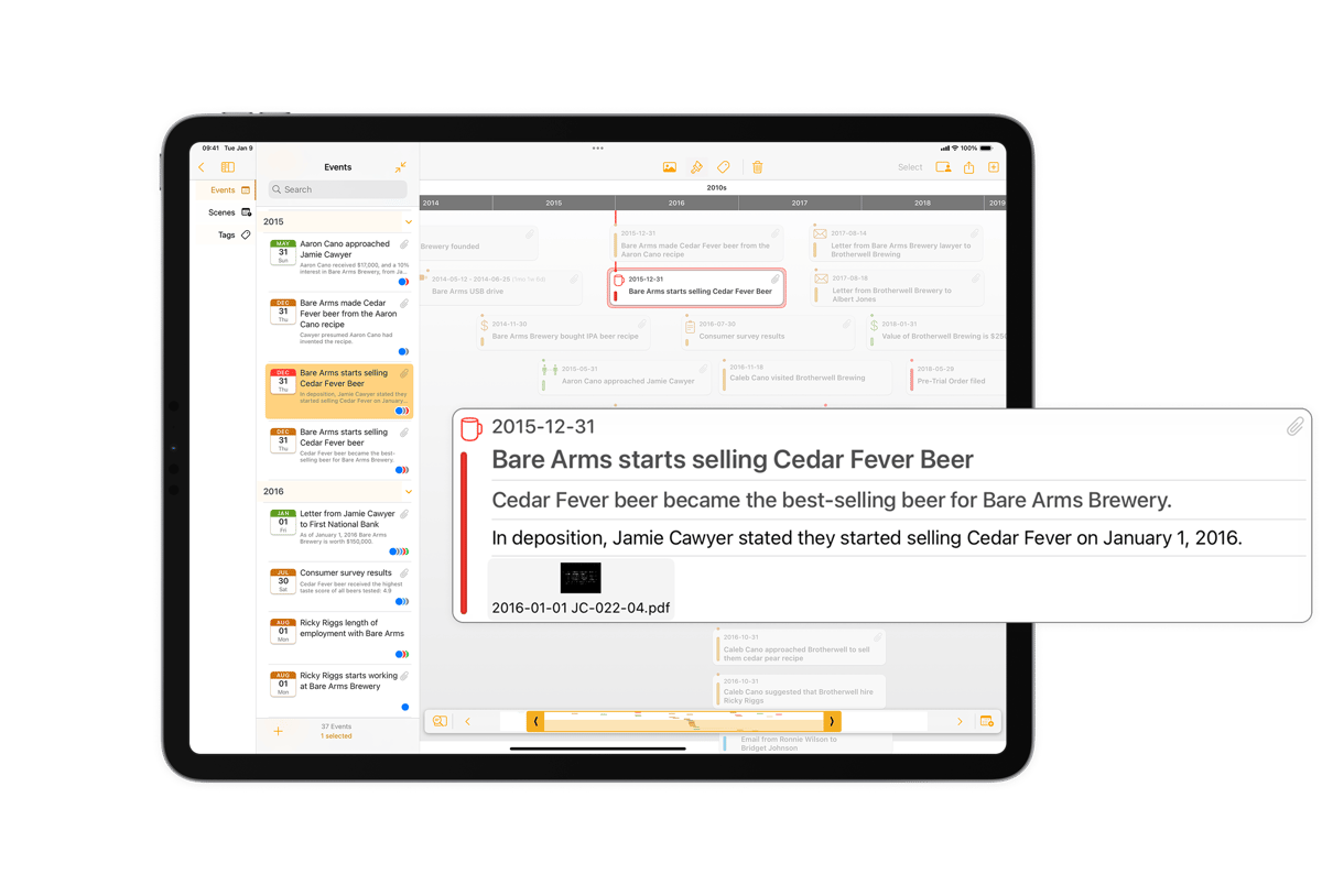 Link people, issues, and facts to events, and enhance visual clarity by adding icons and colors to highlight associations and patterns within your timeline.
