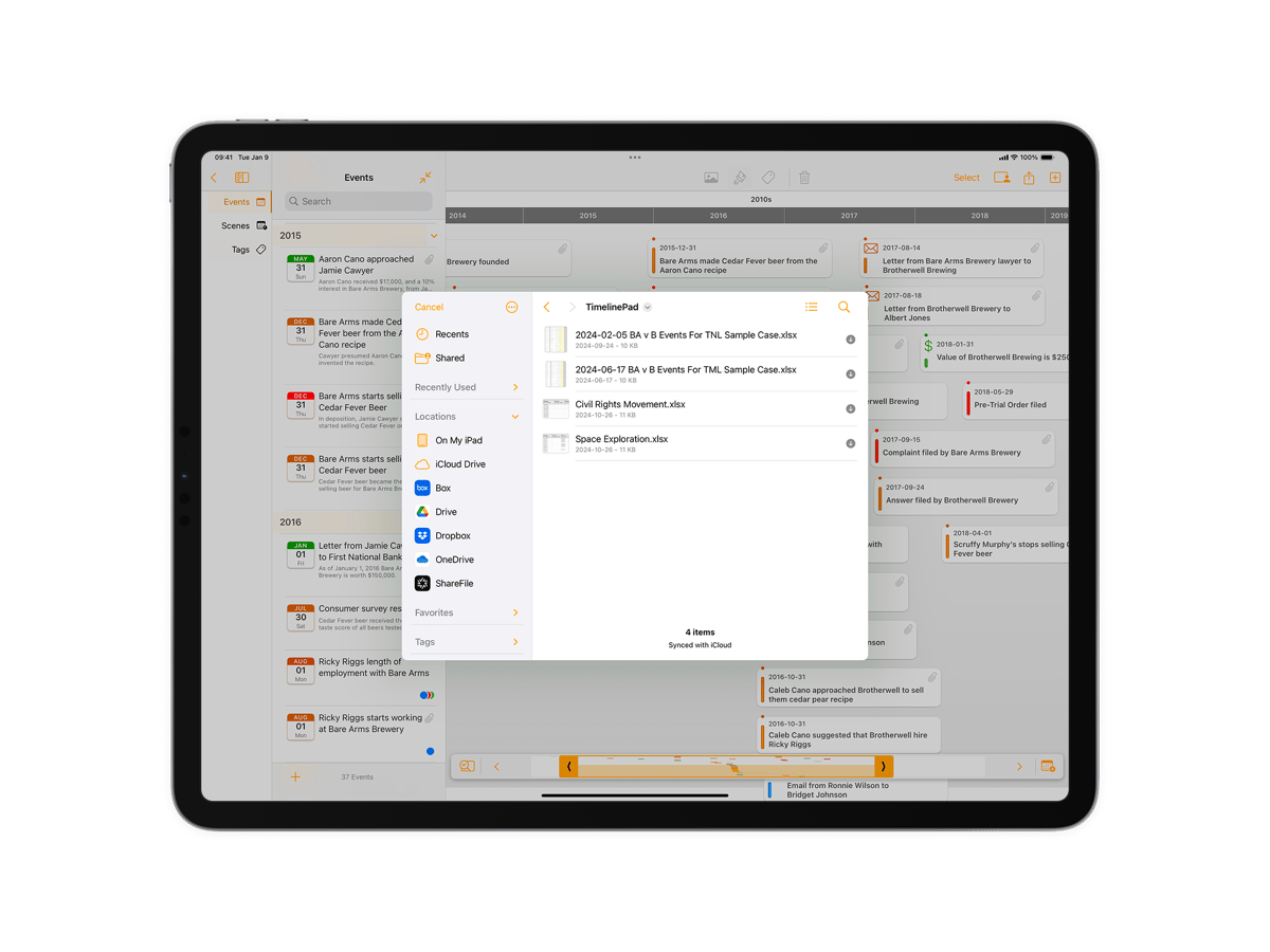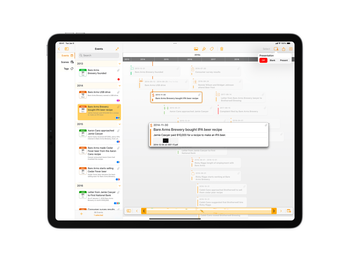 Enhance your timeline by attaching essential documents and images to events, ready to reference and present to your audience.